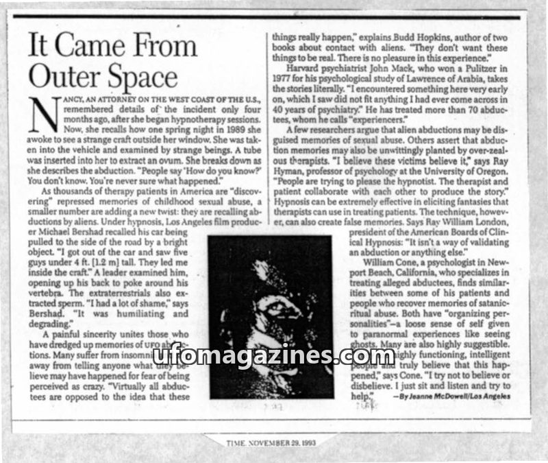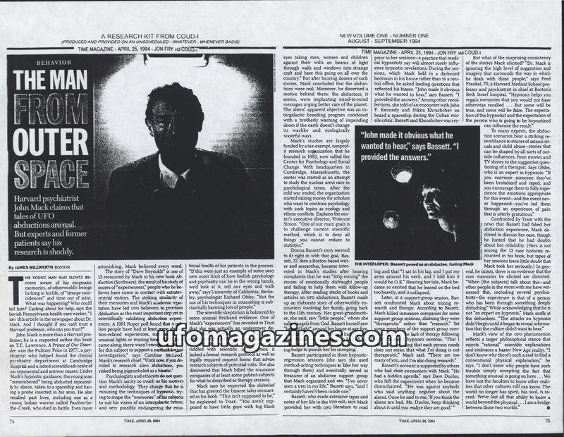 This TIME magazine issue features an investigation into Harvard psychiatrist John Mack's book 'Abduction,' which claims UFO abductions are real and that aliens are sending messages