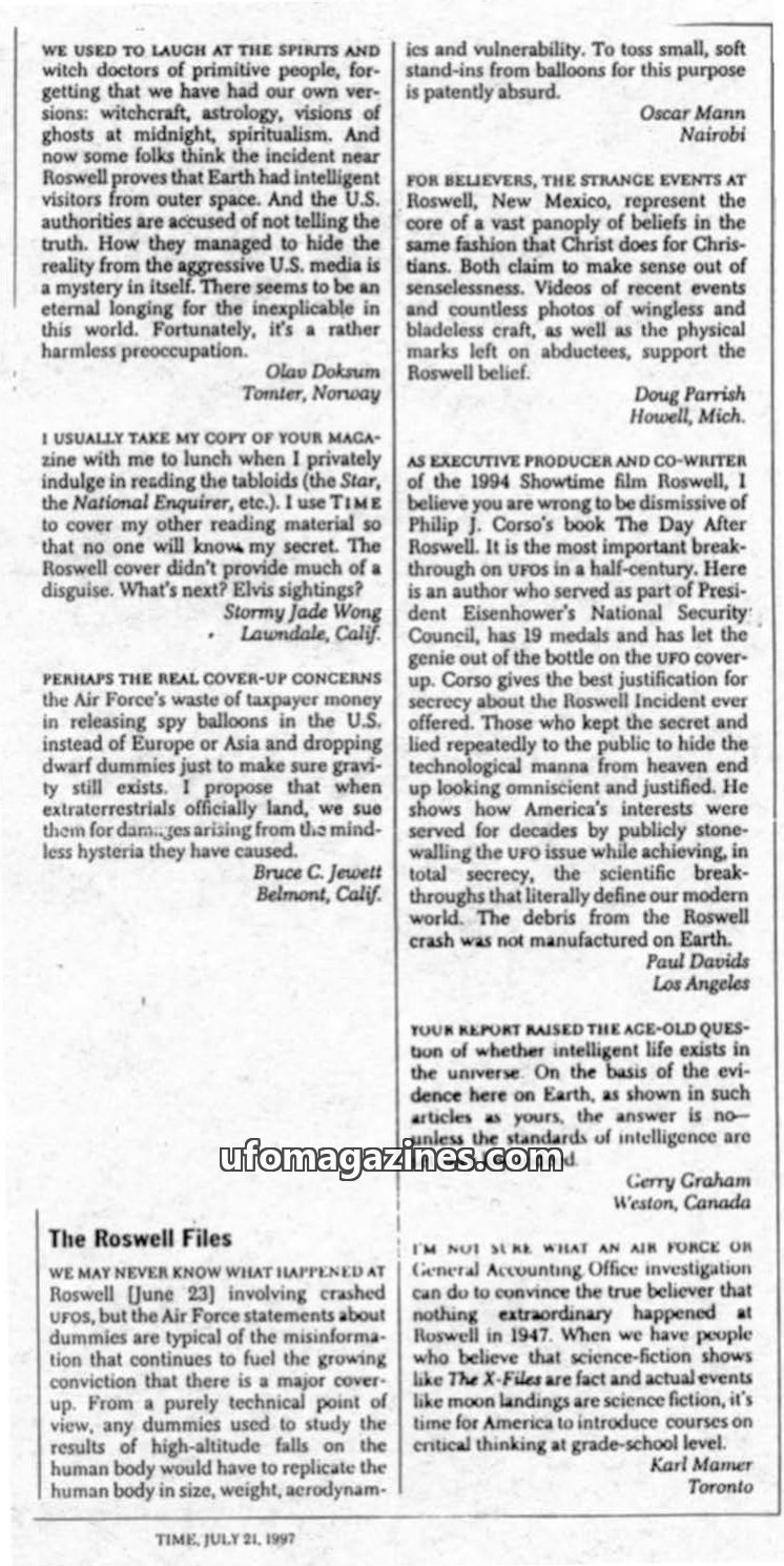This issue of TIME magazine features letters to the editor discussing the Roswell incident. Some writers express skepticism about the official explanations, suggesting a government