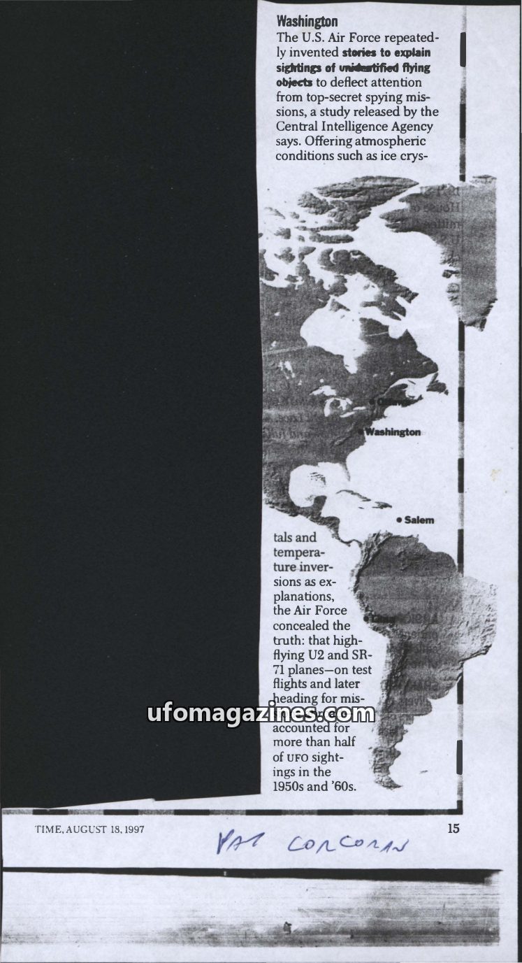 A study released by the Central Intelligence Agency reveals that the U.S. Air Force fabricated explanations for UFO sightings to conceal top-secret spying missions. The Air Force a