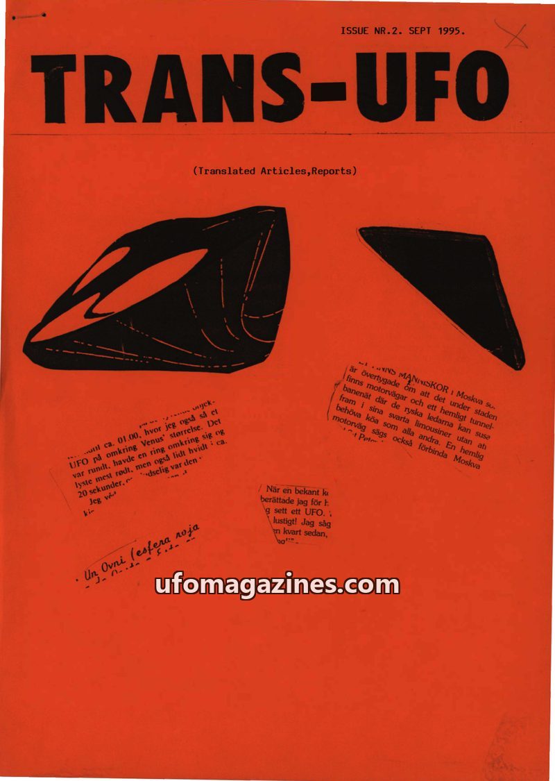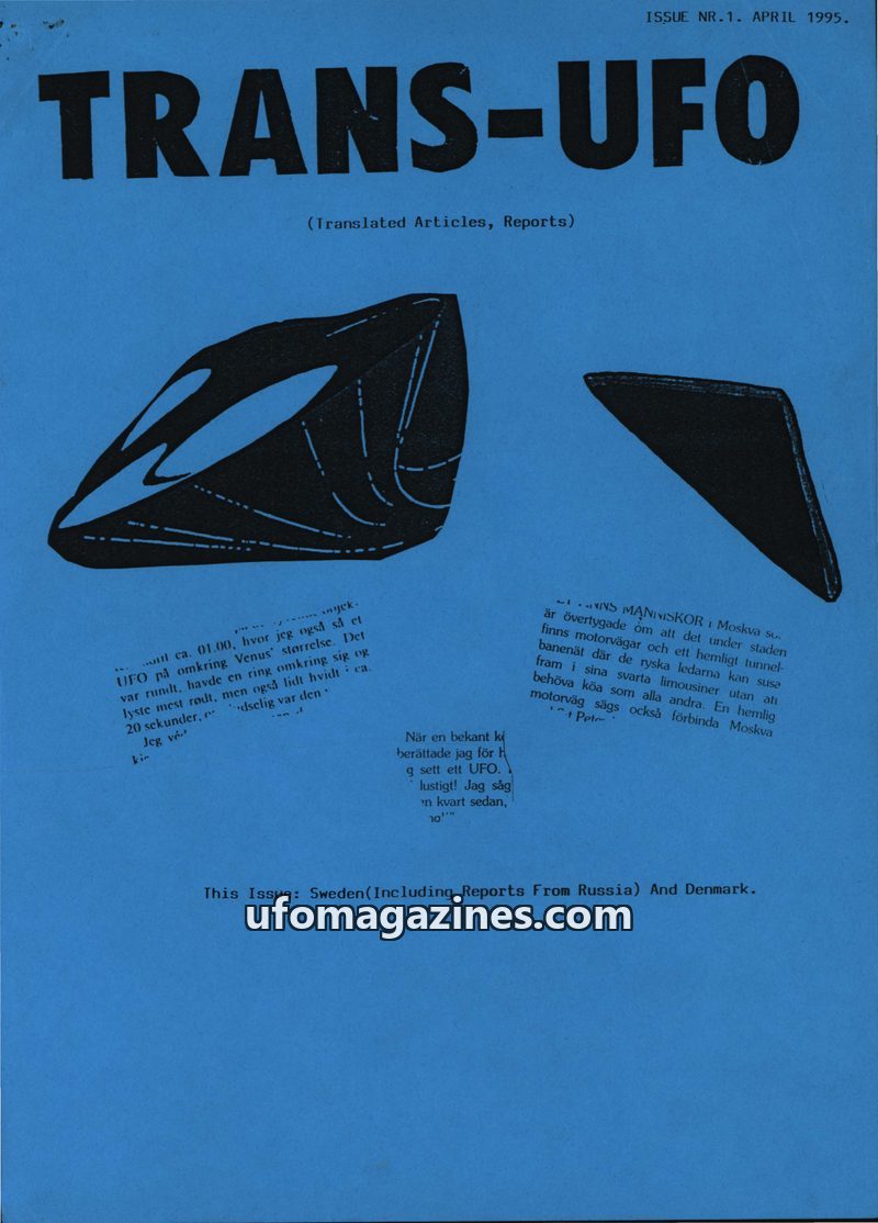 This issue of TRANS-UFO, dated April 1995, focuses on UFO reports from Sweden, Denmark, and Russia. It includes an investigation into a famous UFO photo from Storuman, Sweden, whic