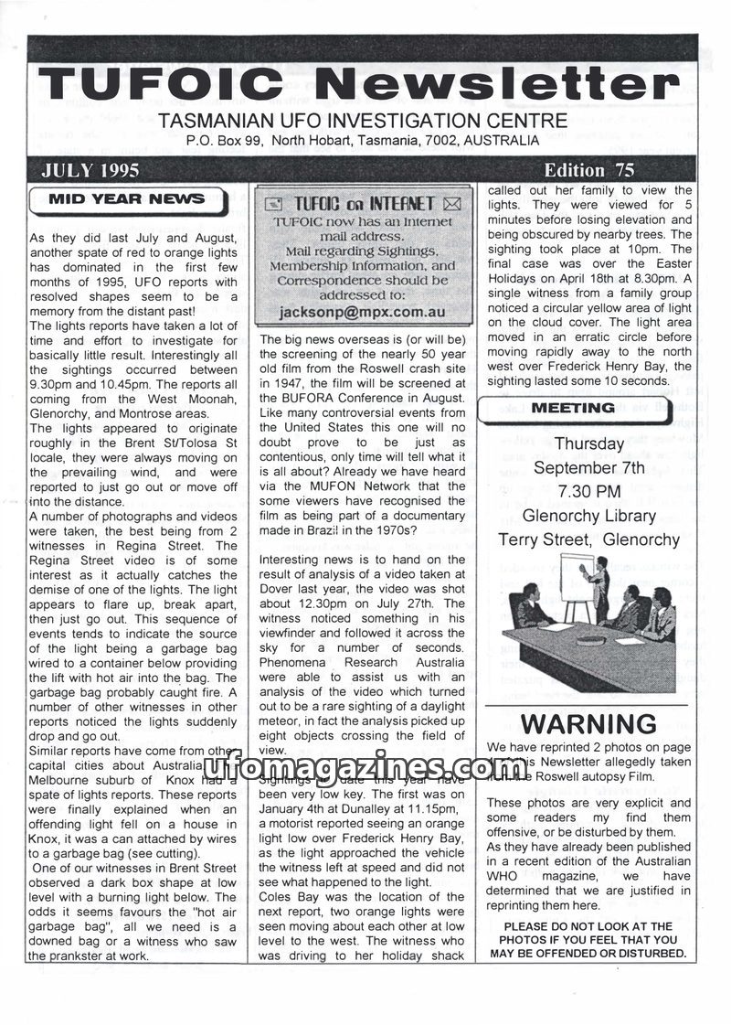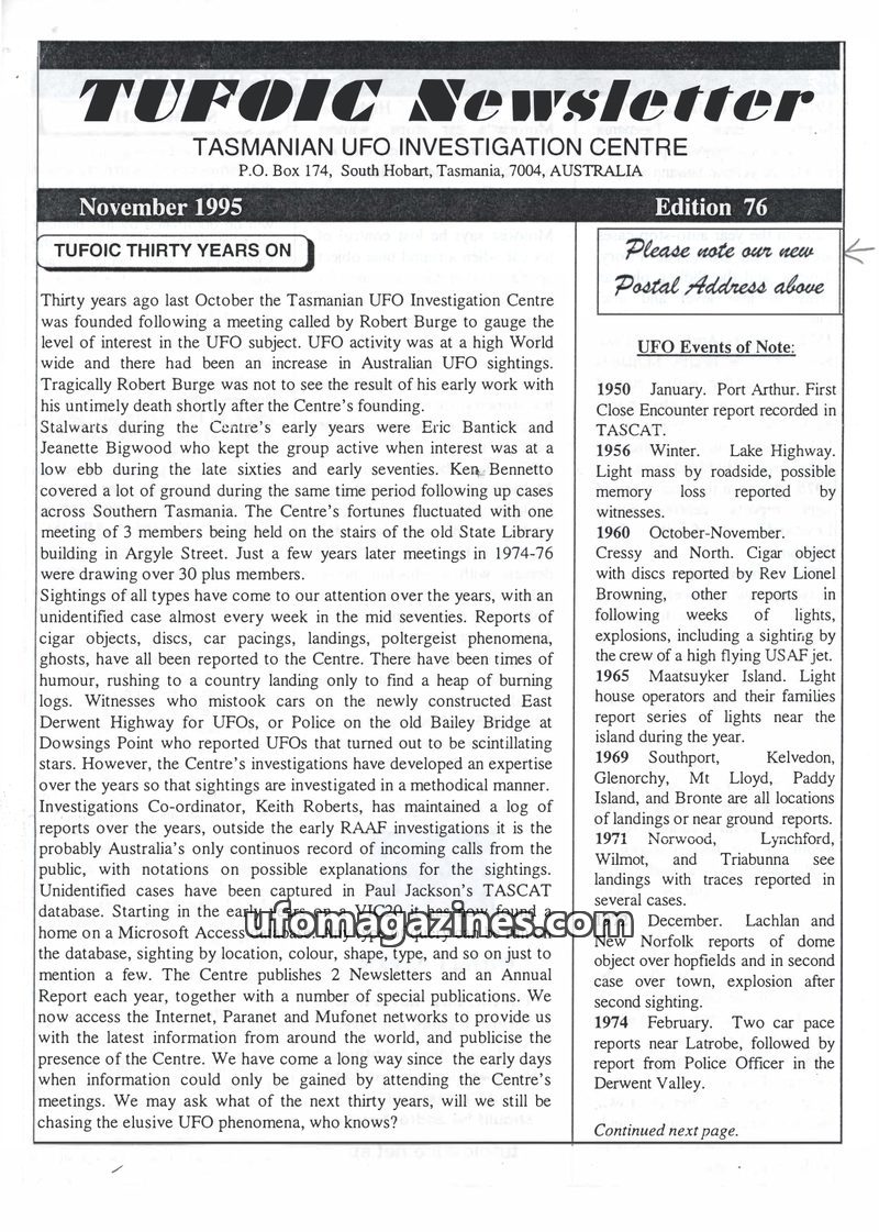 This November 1995 issue of the TUFOIC Newsletter celebrates the Centre's 30th anniversary, highlighting its history of investigating UFO sightings in Tasmania. It details numerous