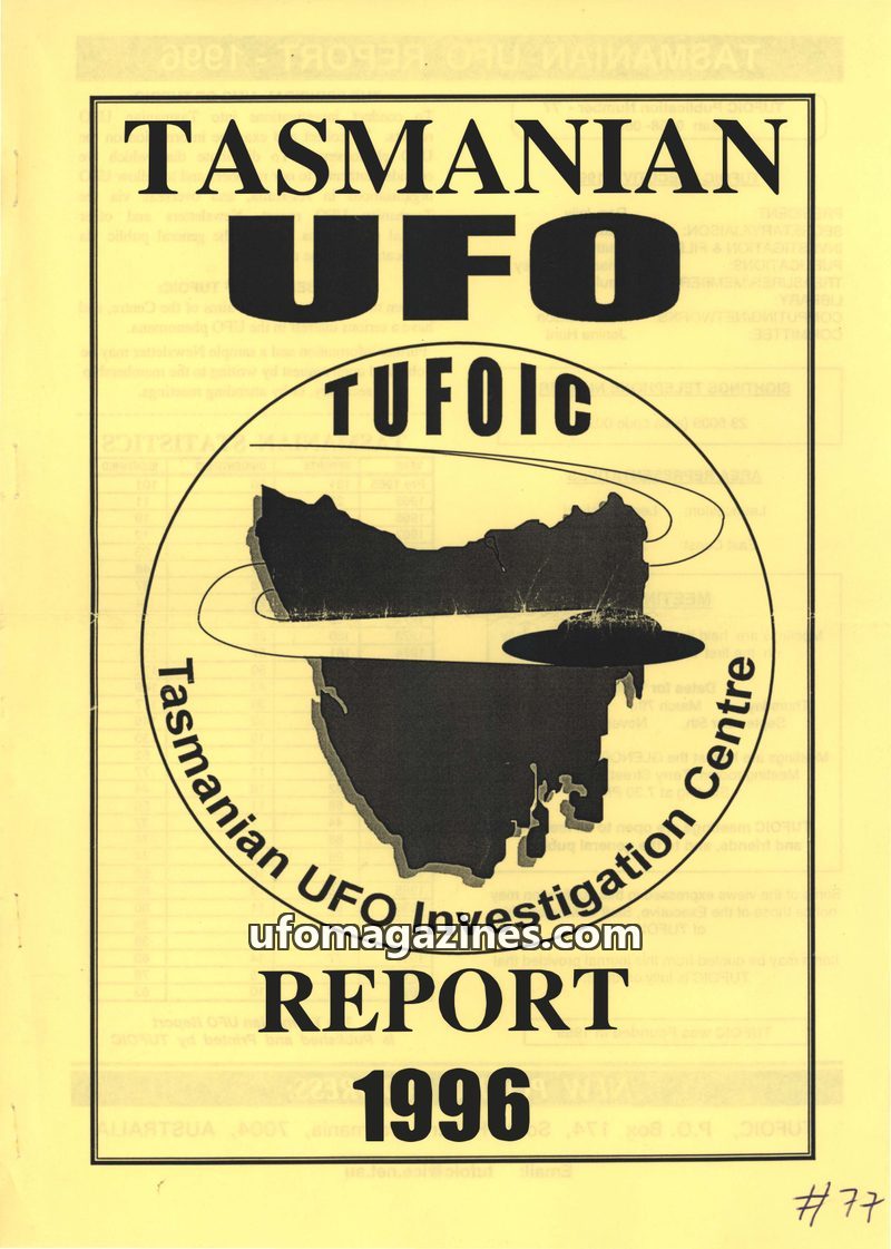 The 1996 Tasmanian UFO Report (Issue 77) covers the year's UFO activities, including a review of 1995 events, noting the impact of the internet and the 'Alien Autopsy' film. It det