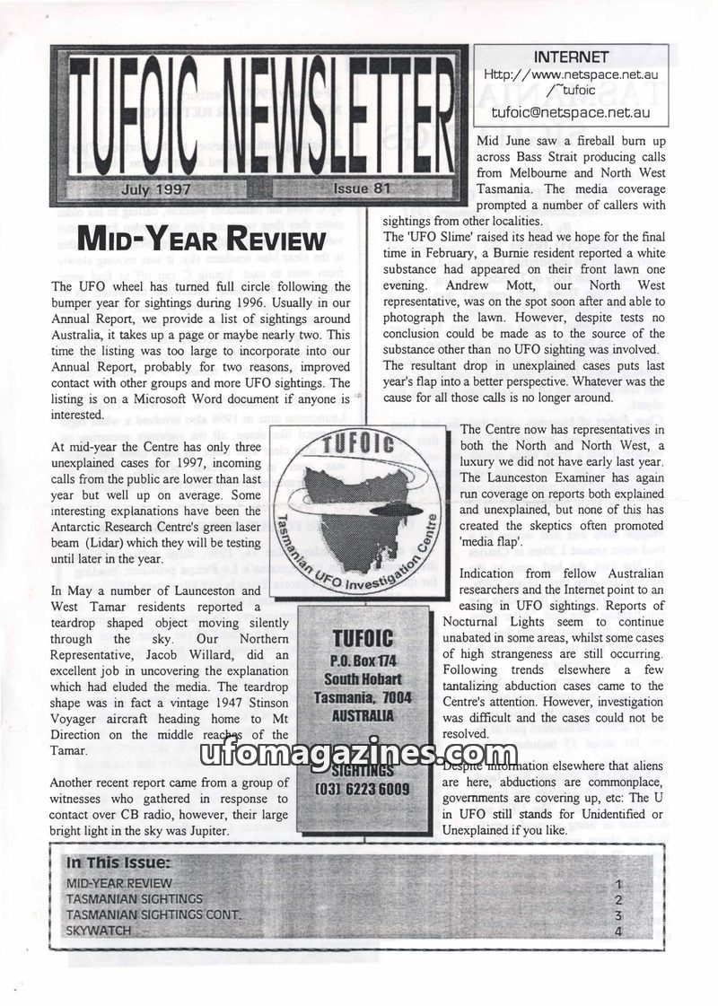 This mid-year review of TUFOIC (Tasmanian UFO Investigation Centre) for July 1997 indicates a decrease in unexplained cases for 1997 compared to the previous year, though incoming