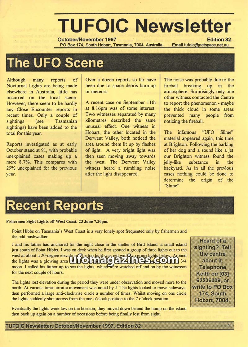 This issue of TUFOIC Newsletter covers various UFO and unexplained phenomena reports from Australia and internationally. It details sightings of lights, unusual objects, and a myst