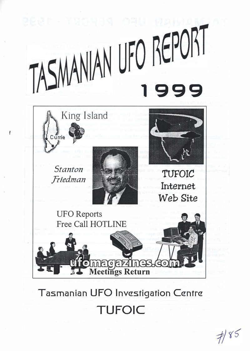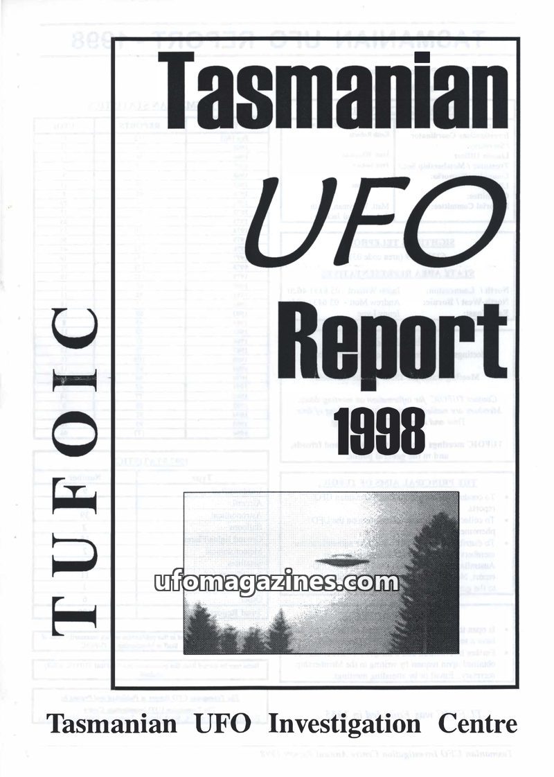 The 1999 issue of the Tasmanian UFO Report details UFO sightings and investigations primarily from 1998. It highlights the work of TUFOIC (Tasmanian UFO Investigation Centre) in co