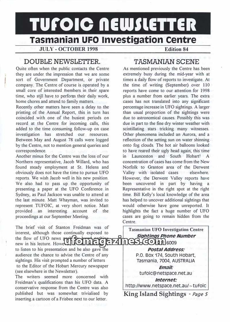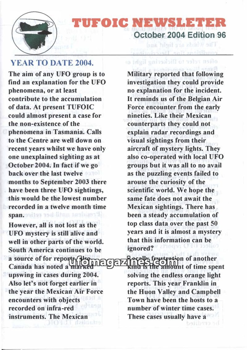 This issue of the TUFOIC Newsletter for October 2004 highlights a general decline in UFO reports in Tasmania, with only one unexplained sighting recorded year-to-date. However, it