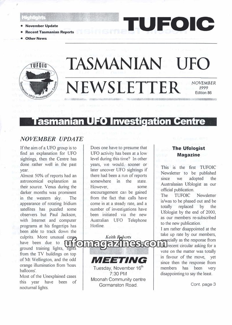 This November 1999 issue of the Tasmanian UFO Newsletter covers recent UFO sightings in Tasmania, with explanations for many being astronomical (Venus, Iridium satellites) or terre