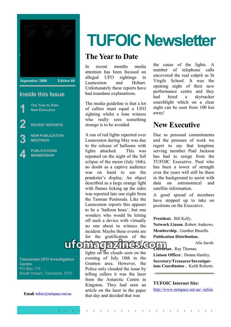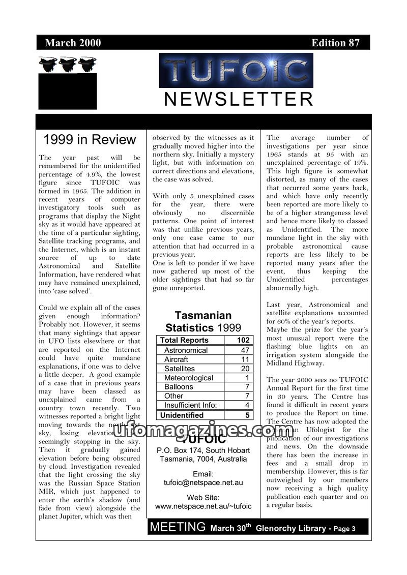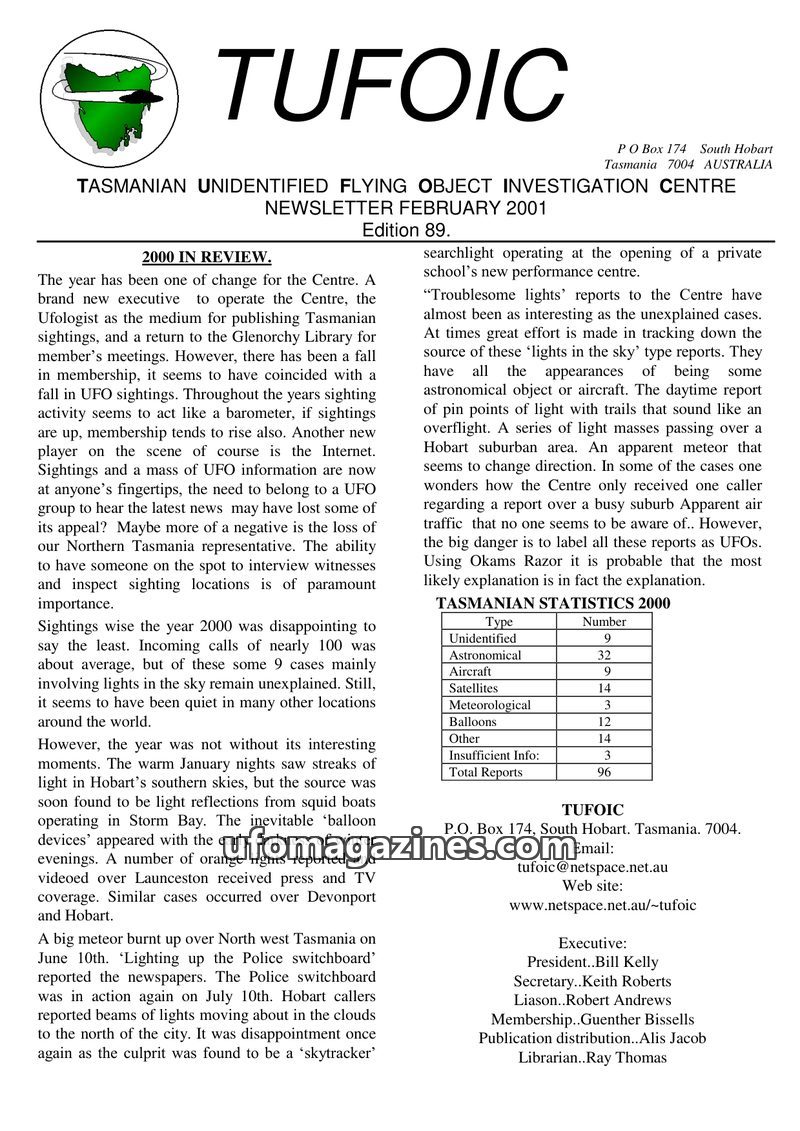 This issue of the TUFOIC Newsletter reviews UFO sightings in Tasmania during the year 2000, noting that many reported incidents had mundane explanations such as balloon hoaxes or s