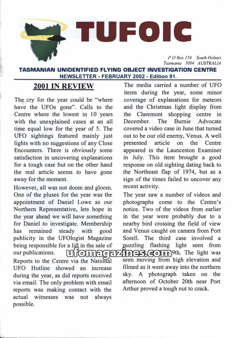 The Tasmanian UFO Investigation Centre's (TUFOIC) 2002 newsletter reviews a year with fewer reported sightings than previous years, with only four cases remaining unidentified. The