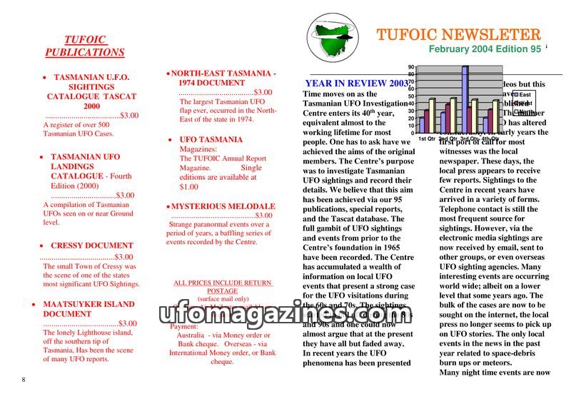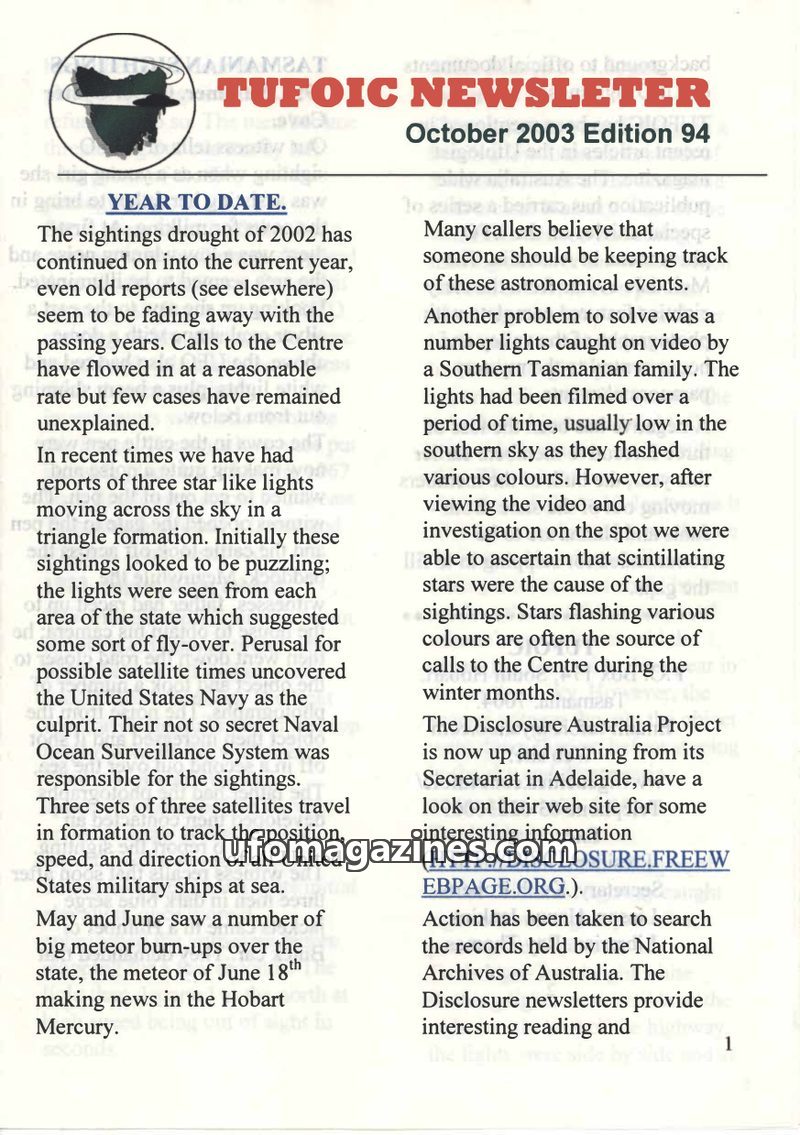 This issue of the TUFOIC Newsletter covers UFO sightings and related phenomena in Tasmania during 2003 and earlier historical periods. It details recent reports of lights attribute