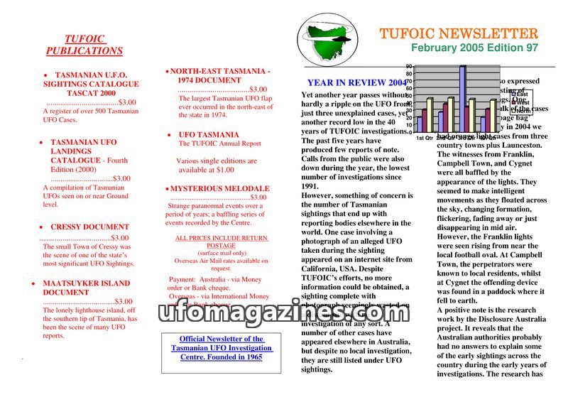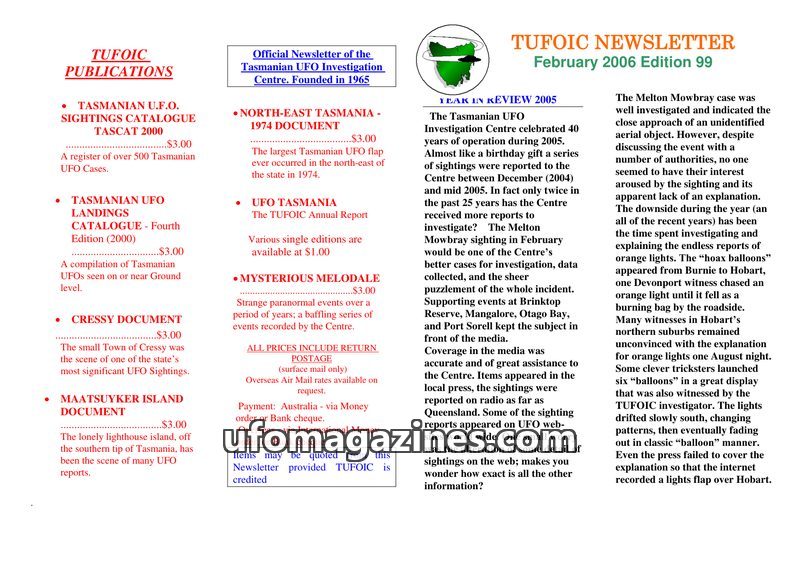 The TUFOIC Newsletter Edition 99 reviews the year 2005, marking the 40th anniversary of the Tasmanian UFO Investigation Centre. The Centre received a significant number of reports,