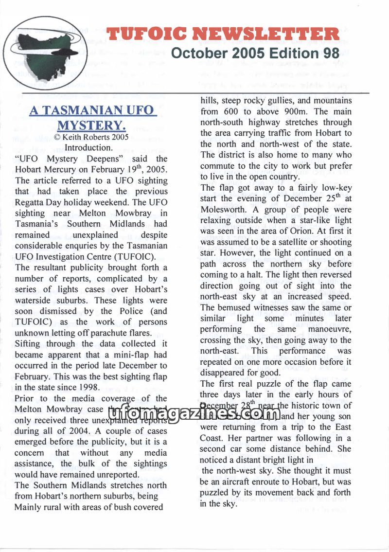 The October 2005 TUFOIC Newsletter details a 'mini-flap' of UFO sightings in Tasmania between late December 2004 and February 2005, with the Melton Mowbray sighting gaining signifi