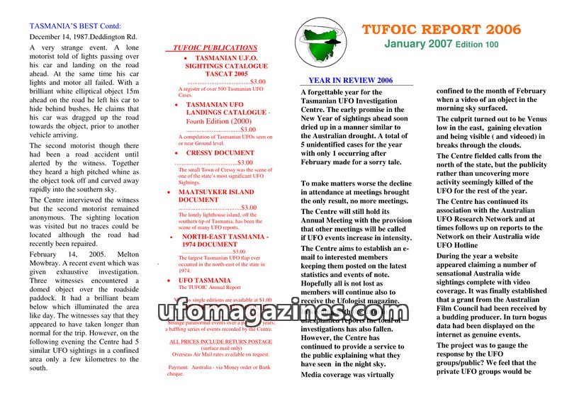 The TUFOIC Report 2006 details a quiet year for UFO investigations in Tasmania, with only 5 unidentified cases reported, most occurring early in the year. Despite a decline in meet