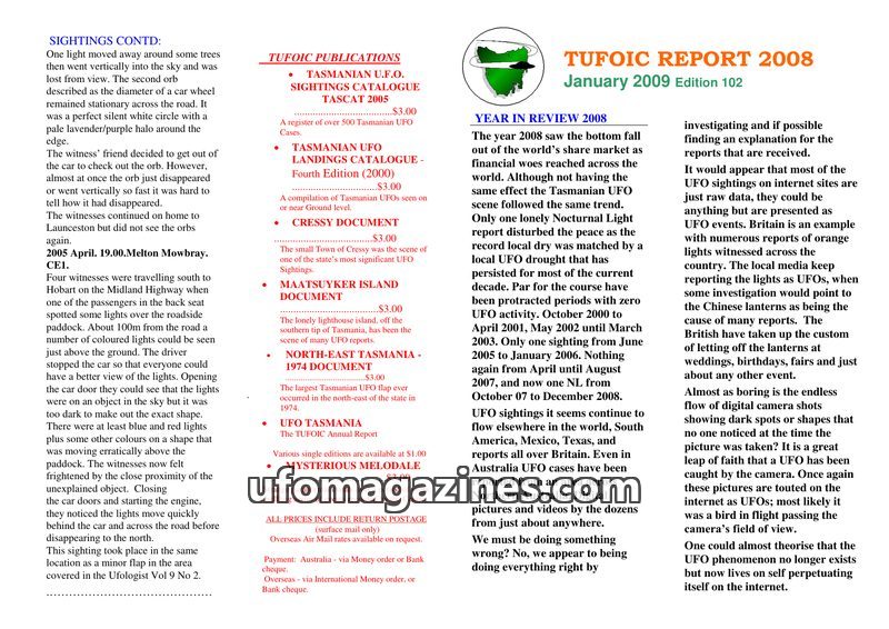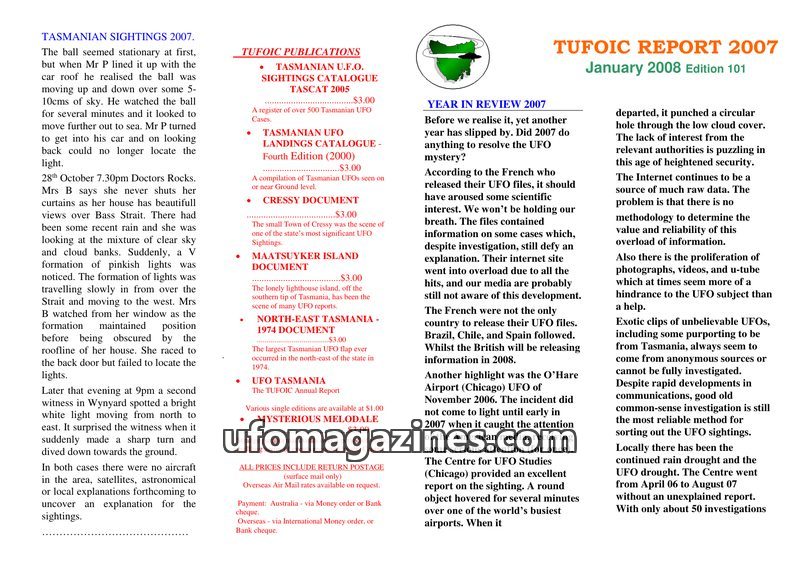 The TUFOIC Report 2007, published in January 2008, details a quiet year for UFO sightings in Tasmania with only 49 investigations. Notable events include sightings of V-formations,
