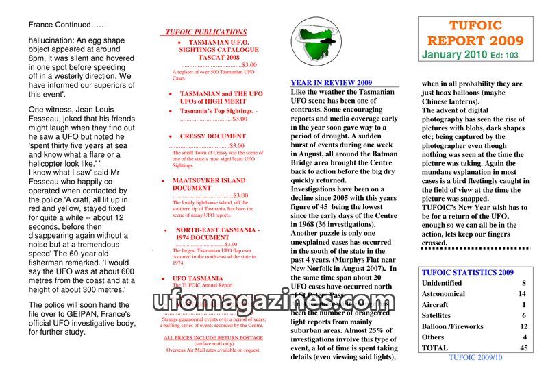 This issue of TUFOIC Report 2009 covers UFO sightings and investigations from 2009, with a focus on Tasmania, Australia. It notes a decline in investigations since 2005, with only