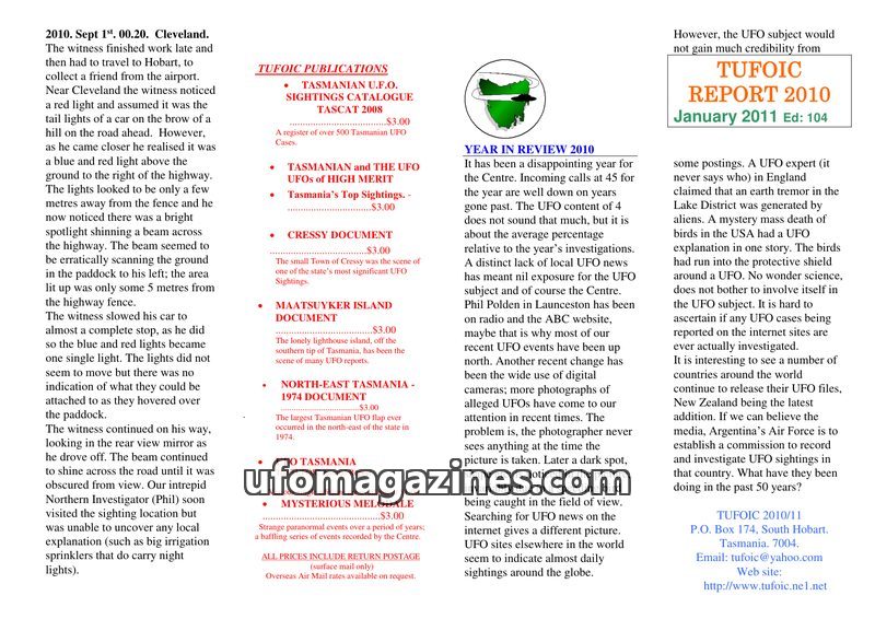 This issue of TUFOIC Report covers UFO sightings in Tasmania during 2010, detailing specific incidents in Cleveland, Kingsmeadows, South Launceston, and Coles Bay. The report notes