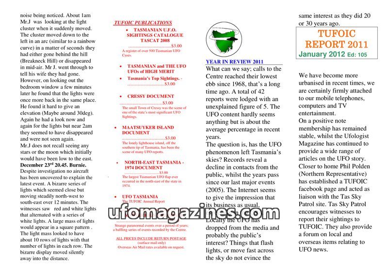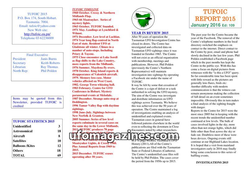 The Tasmanian UFO Investigation Centre (TUFOIC) ceased operations in December 2015 after 50 years of investigating UFO sightings in Tasmania. The Centre's final report for 2015 not