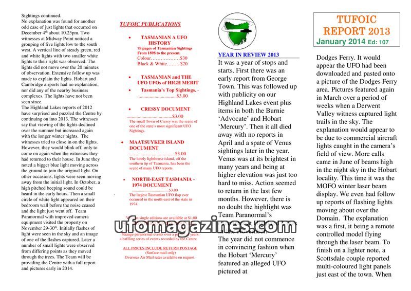This issue of the TUFOIC Report covers UFO sightings in Tasmania during 2013, detailing various incidents from Midway Point to Highland Lakes. It highlights the shift from direct t