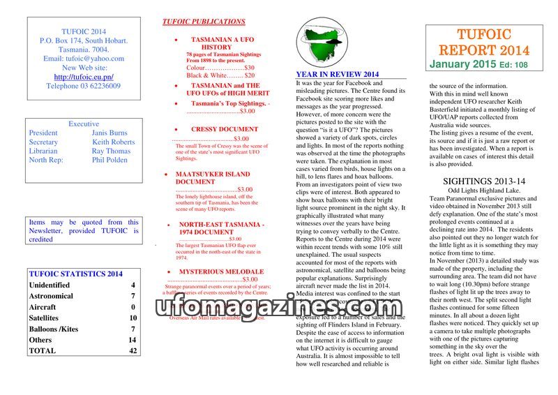 The TUFOIC Report 2014, published in January 2015, reviews UFO and UAP activity in Australia, with a significant focus on Tasmania. The report highlights the increasing use of soci