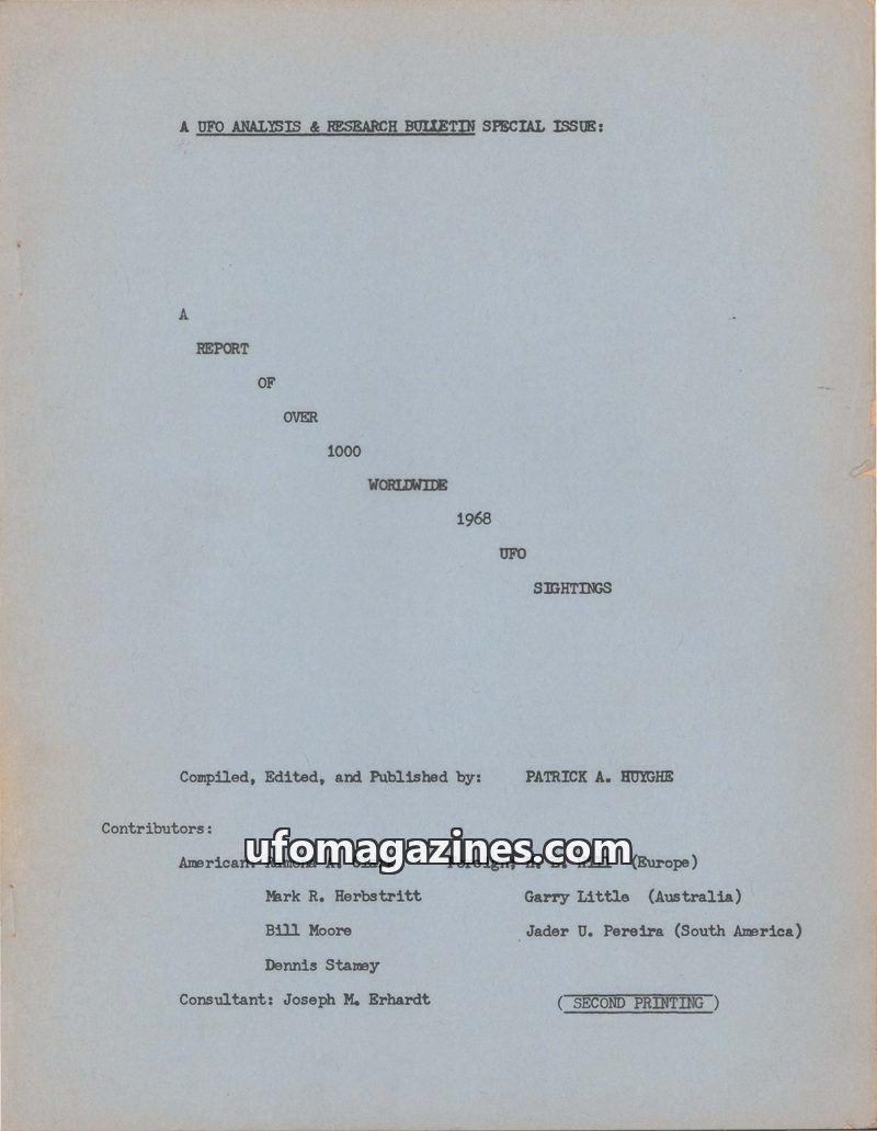 This special issue of the UFO Analysis & Research Bulletin presents a comprehensive chronology of over 1000 UFO sightings reported worldwide in 1968. It includes detailed lists of