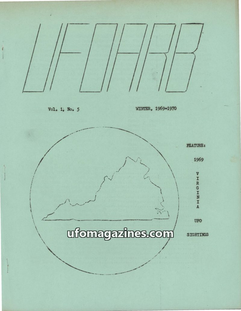 This issue of UFOARB, published in Winter 1969-1970, focuses on UFO sightings in Virginia during 1969. It includes an editorial discussing the end of Project Blue Book and the Air