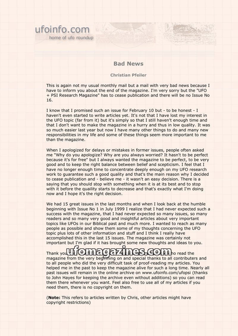 The editor of 'UFO + PSI Research Magazine', Christian Pfeiler, has announced the magazine will cease publication with no Issue No. 16 being released. This decision stems from a la
