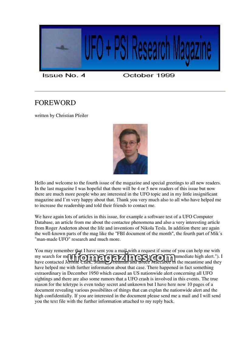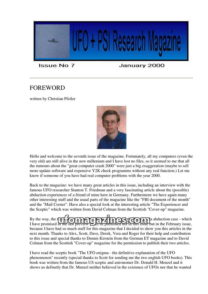 This issue of UFO + PSI Research Magazine (February 2000) features a foreword by Christian Pfeiler announcing the upcoming website. It includes the second part of 'Alex's' abductio