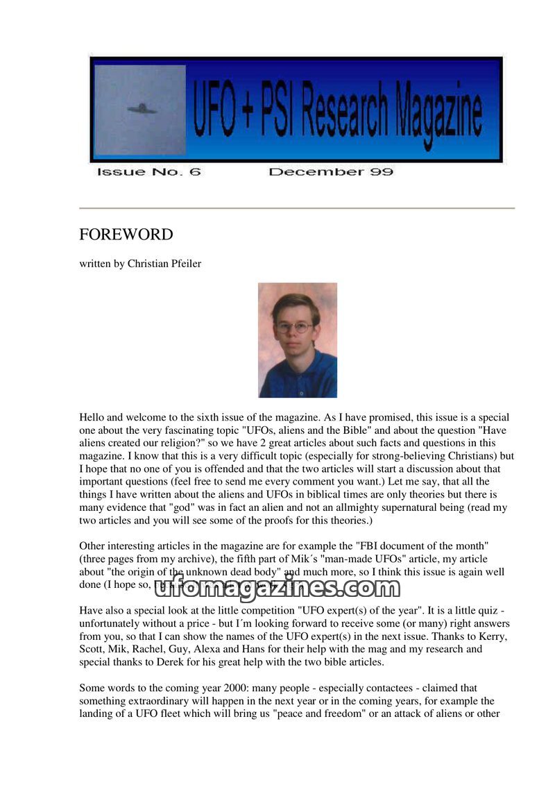 This issue of UFO + PSI Research Magazine, dated March 2000, includes a foreword by Christian Pfeiler and features articles on a controversial Bible-related topic from the 'Book of