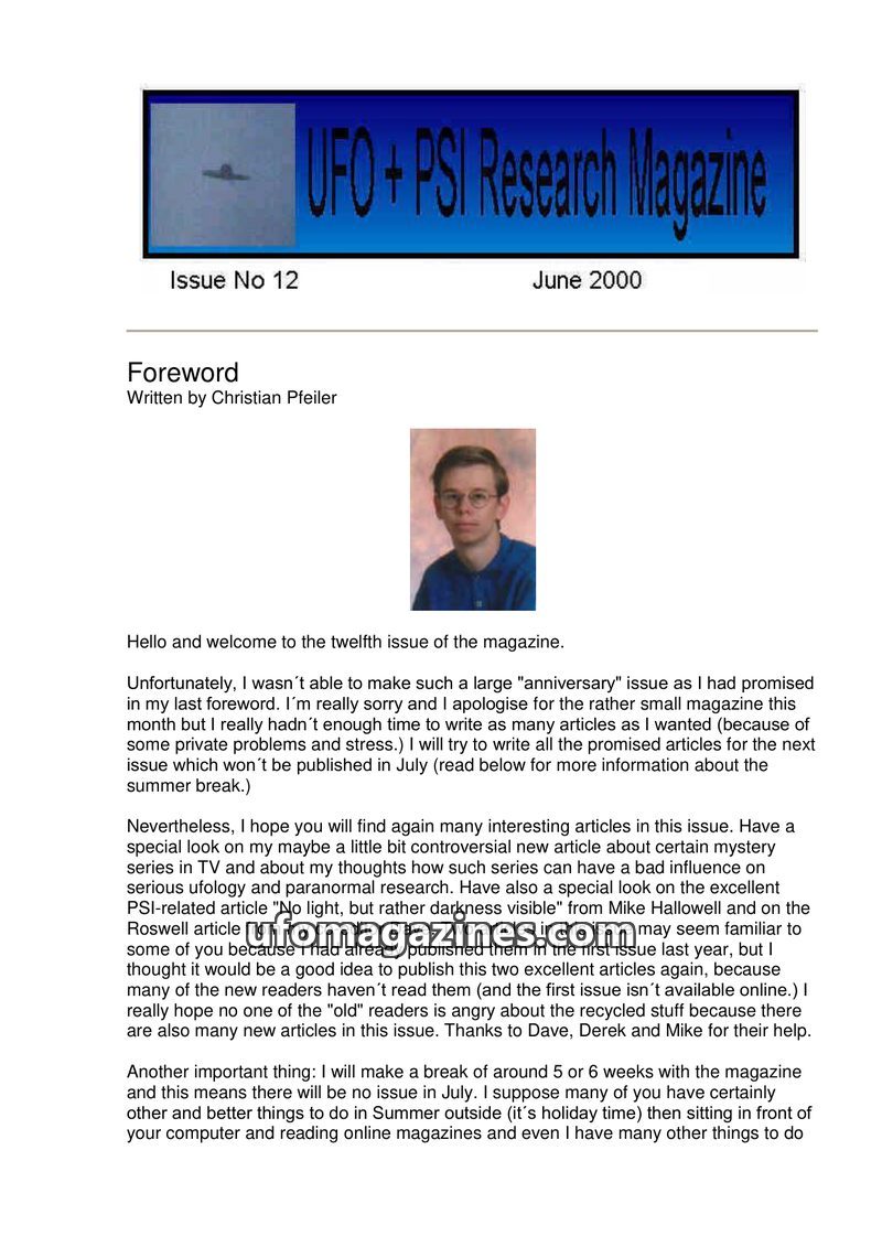 This issue of UFO + PSI Research Magazine, dated May 2000, marks its eleventh publication and is celebrating its first anniversary. The editor, Christian Pfeiler, highlights articl