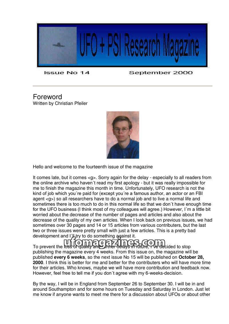 This issue of UFO + PSI Research Magazine, dated September 2000, addresses a delay in publication and announces a shift to a 6-week schedule. The foreword by Christian Pfeiler disc
