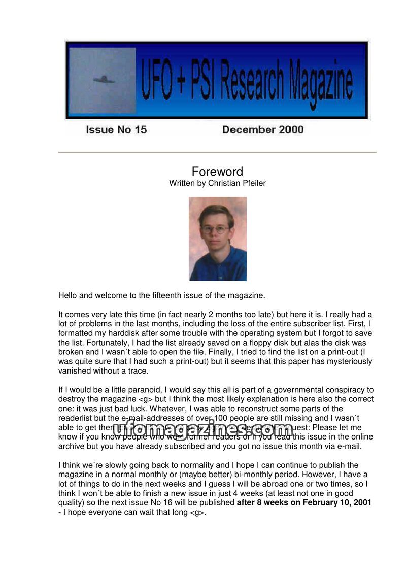 This issue of UFO + PSI Research Magazine, dated December 2000, is the fifteenth issue and was published late due to technical difficulties, including the loss of the subscriber li