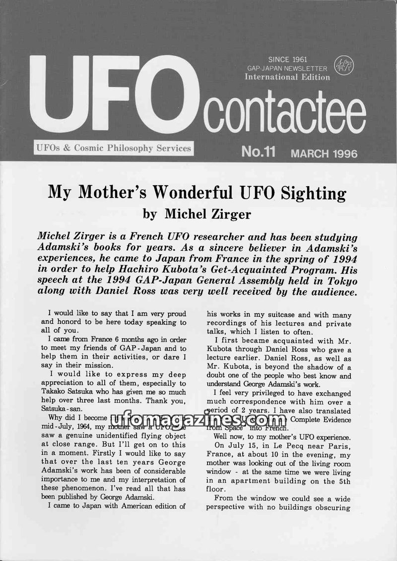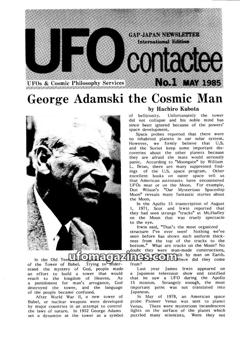 This issue of UFO Contactee focuses on George Adamski and his philosophy, exploring alleged UFO sightings and encounters. It details reports from Japan, including sightings by high