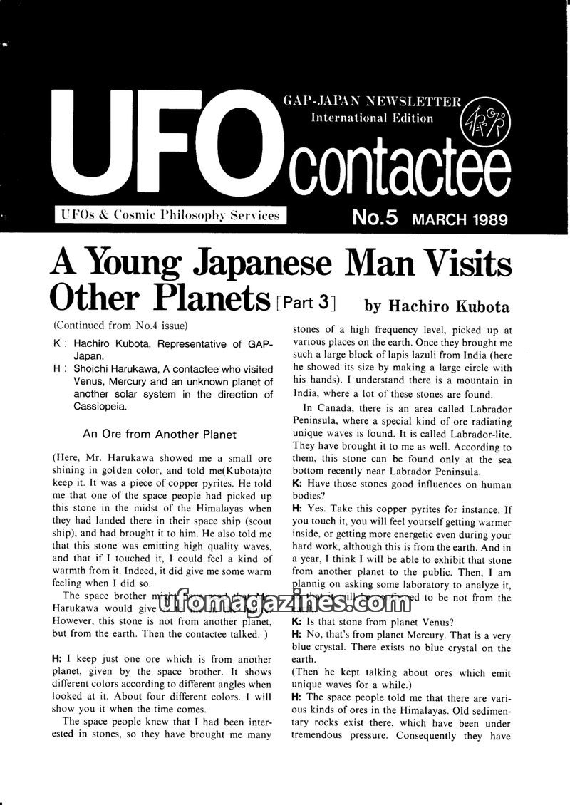 This issue features an interview with Shoichi Harukawa, a Japanese contactee who claims to have visited Venus, Mercury, and another planet, detailing his telepathic abilities and e