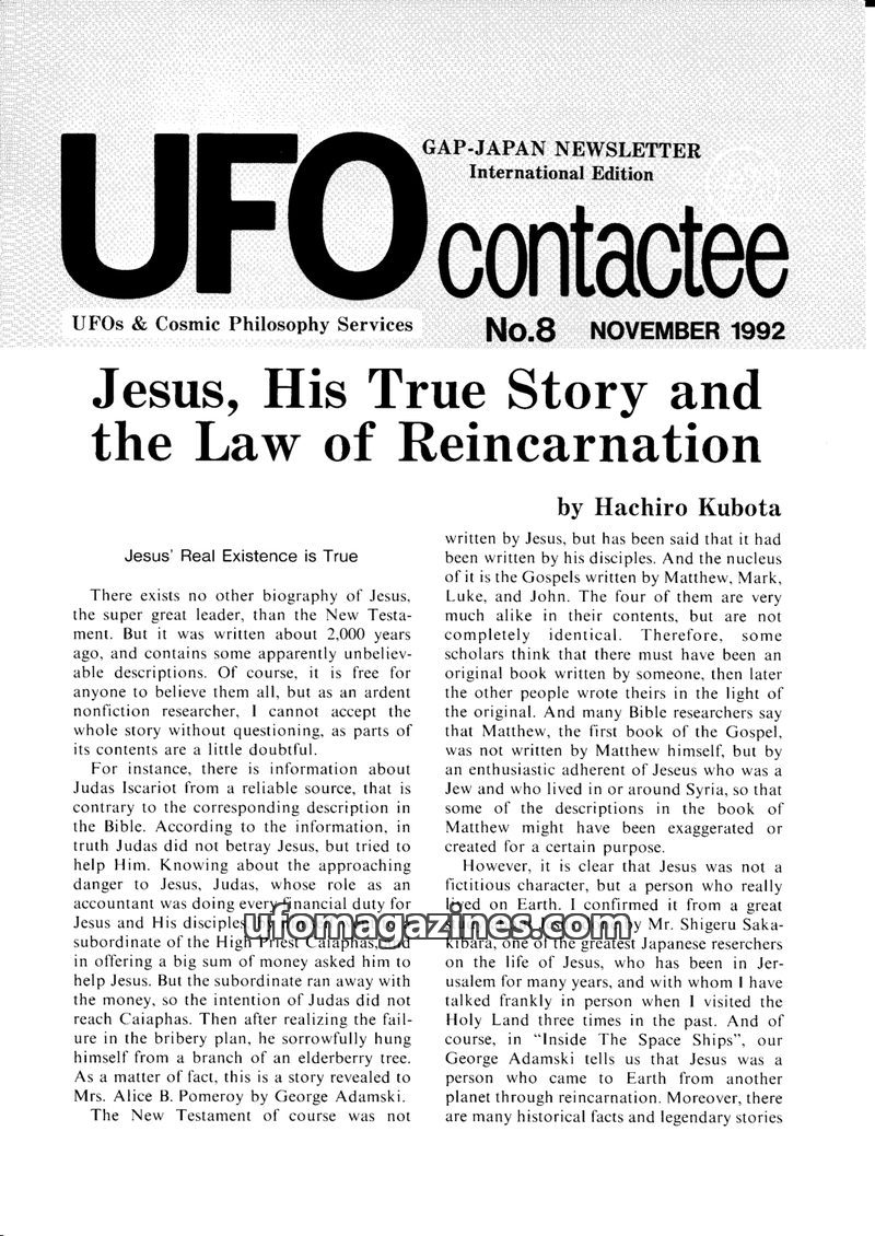 This issue of UFO contactee delves into the life of Jesus Christ, presenting a theory that he was a Venusian reincarnated on Earth, as recounted by George Adamski. It includes desc