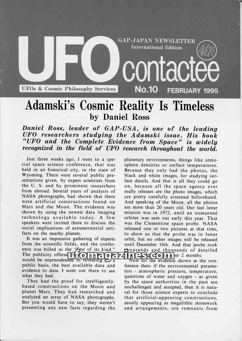 This issue features Daniel Ross's exploration of George Adamski's teachings on cosmic reality and UFOs. It highlights evidence of artificial constructions on Mars and the Moon, dis