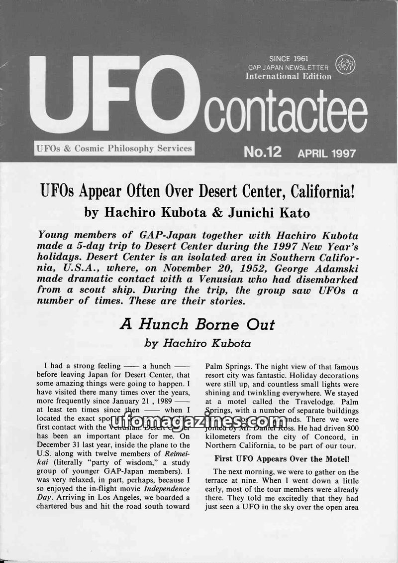 This issue of UFO contactee details a 1997 New Year's trip by GAP-Japan members to Desert Center, California, a site famous for George Adamski's 1952 contact with a Venusian. The g