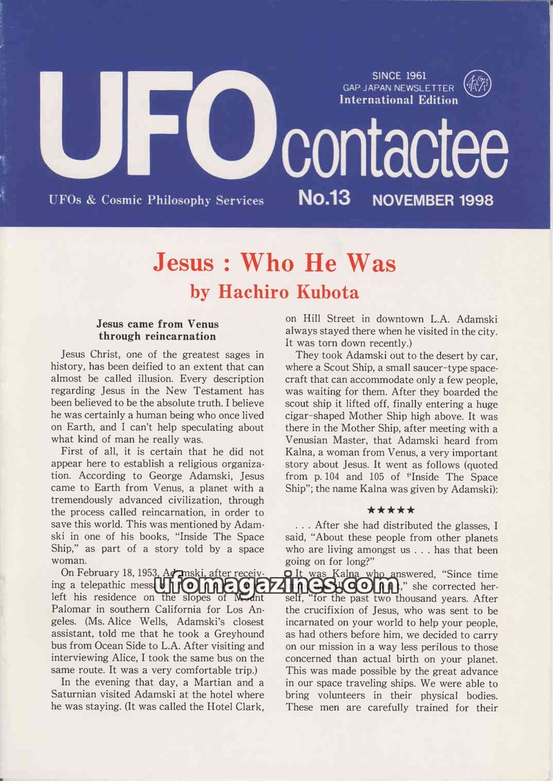 This issue of UFO contactee explores the possibility of Jesus Christ being a Venusian who reincarnated on Earth. It presents accounts from George Adamski, who claimed to have met s
