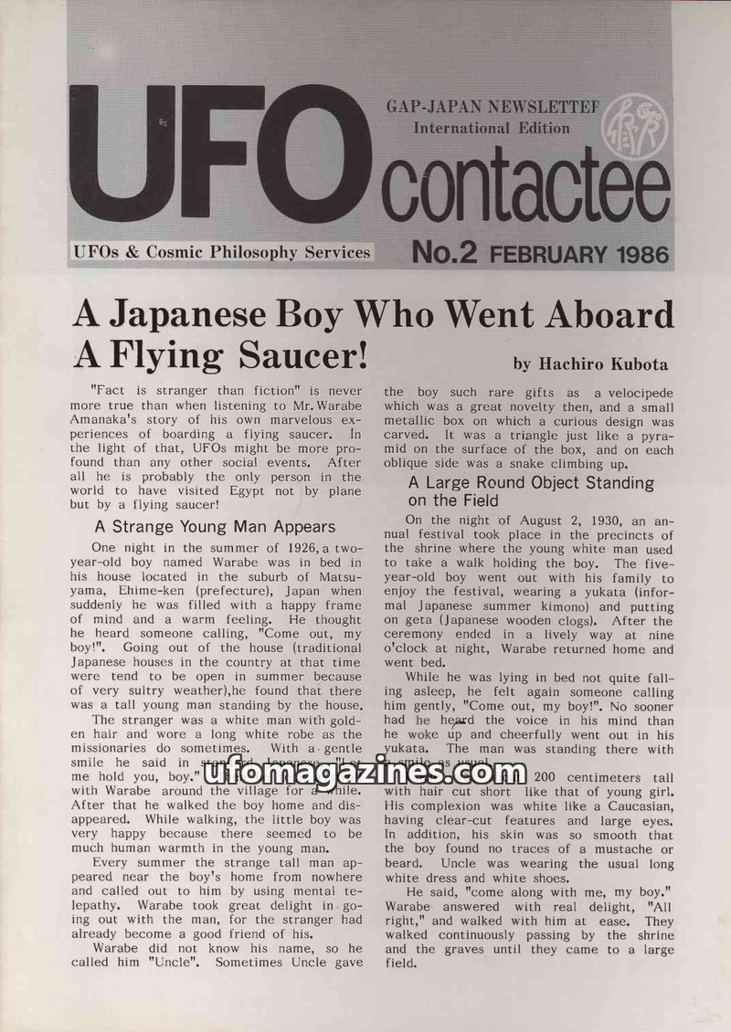 This issue features the account of Warabe Amanaka, who claims to have boarded a flying saucer as a child in Japan, taken on trips to see whales, elephants, and even visit Egypt. Th