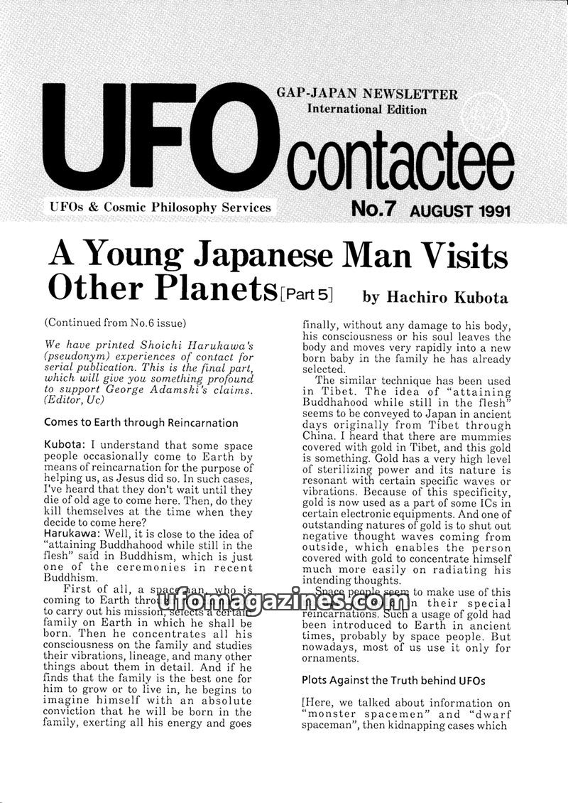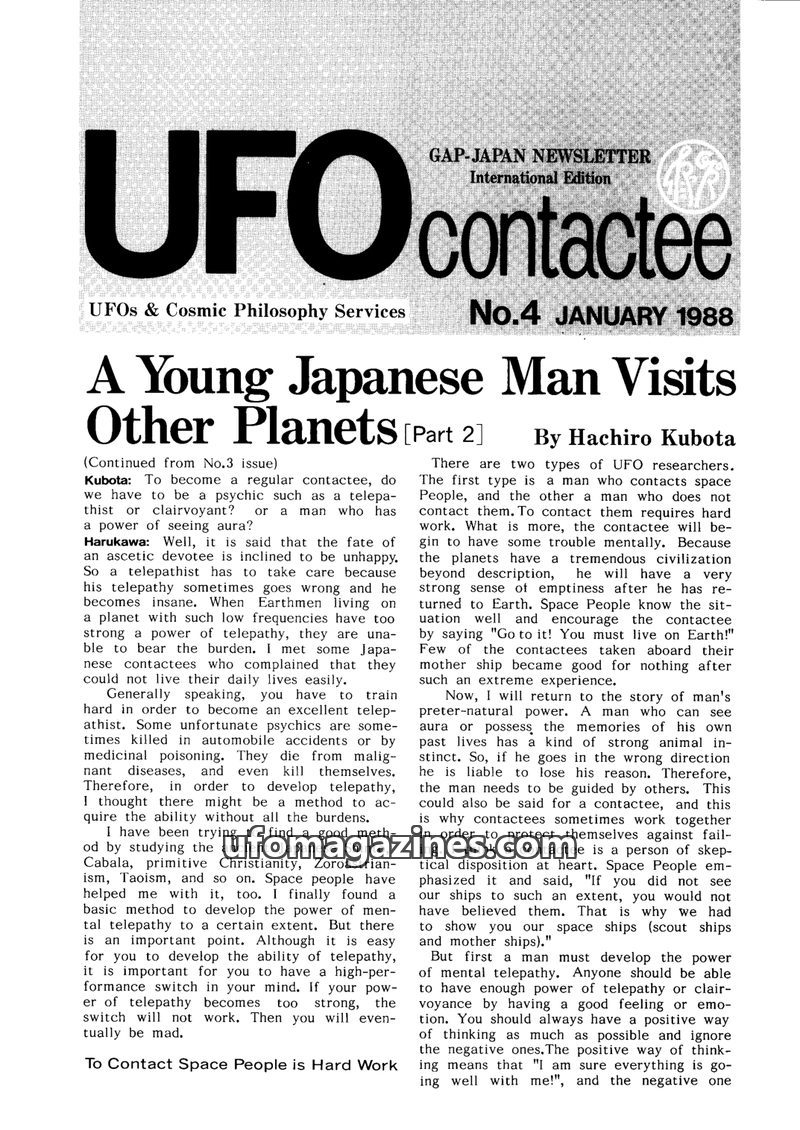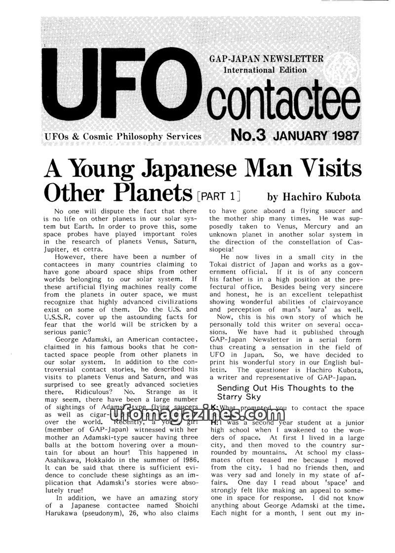 This issue of UFO Contactee features an interview with Hachiro Kubota discussing a young Japanese man's experiences visiting other planets, touching on reincarnation and the concep