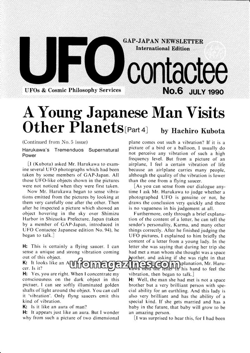 This issue of UFO Contactee delves into the experiences of Mr. Harukawa, a Japanese contactee with supernatural abilities, who can sense vibrations from UFO photographs and letters