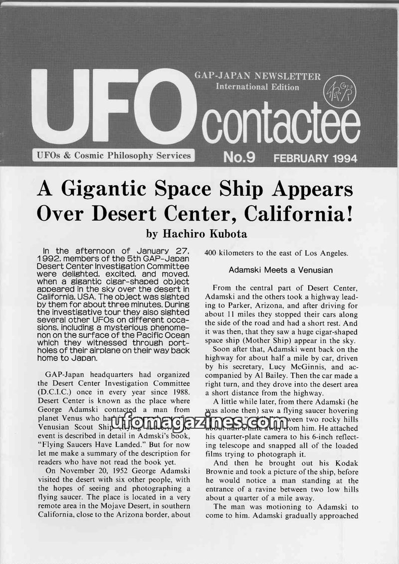 This issue of UFO contactee details a sighting of a gigantic cigar-shaped object over Desert Center, California, by the GAP-Japan Desert Center Investigation Committee on January 2