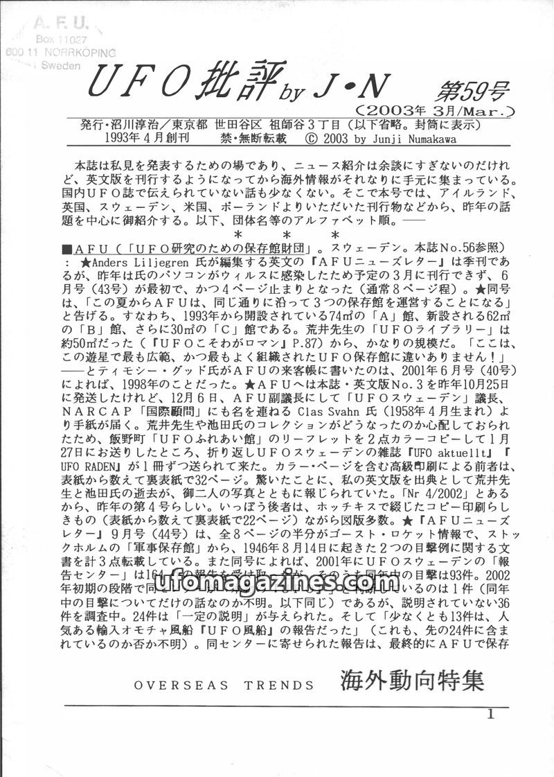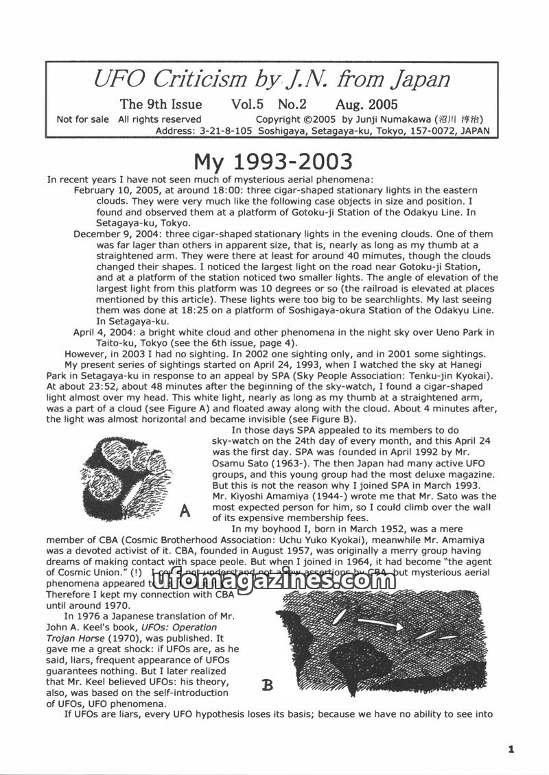 This issue of 'UFO Criticism by J.N. from Japan' focuses on the author's personal UFO sightings between 1993 and 2003, including observations of cigar-shaped lights and phenomena o
