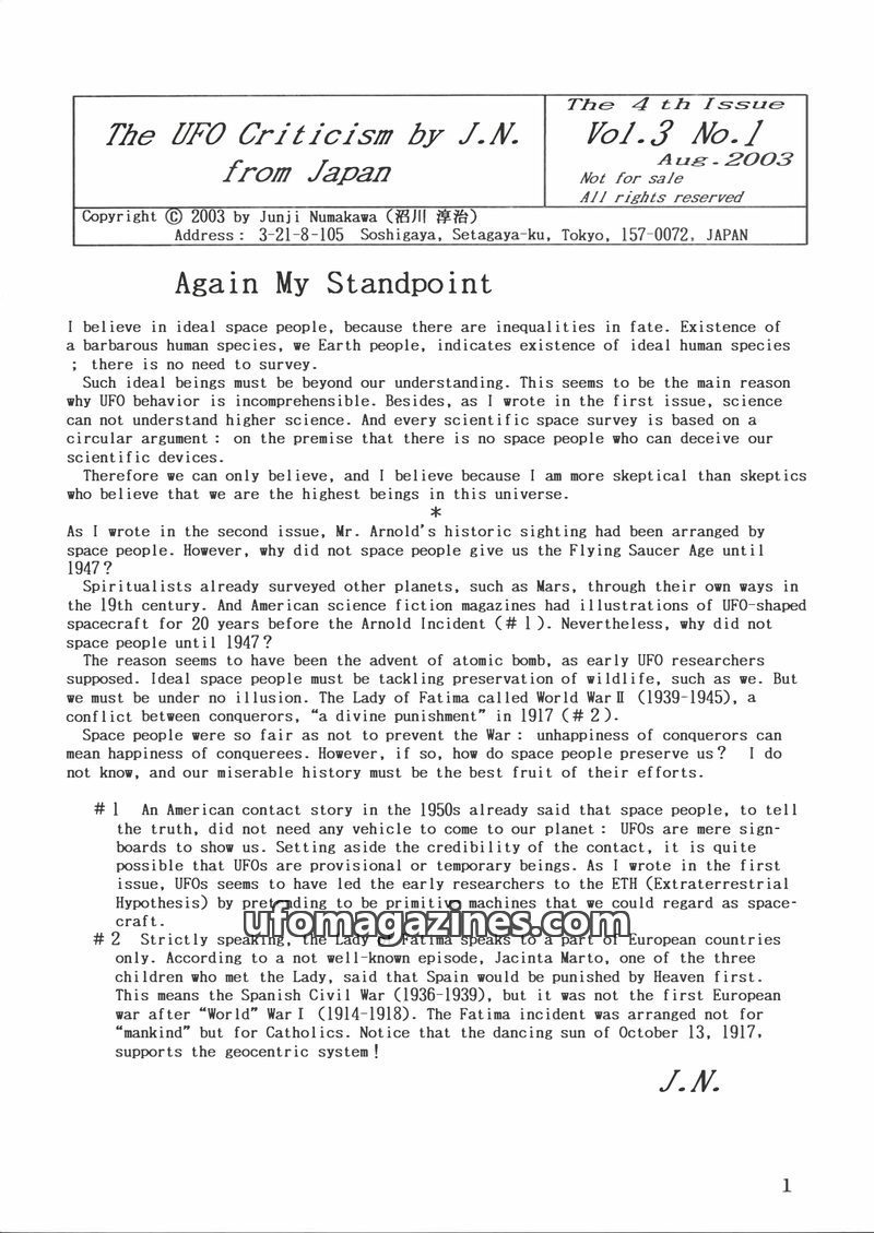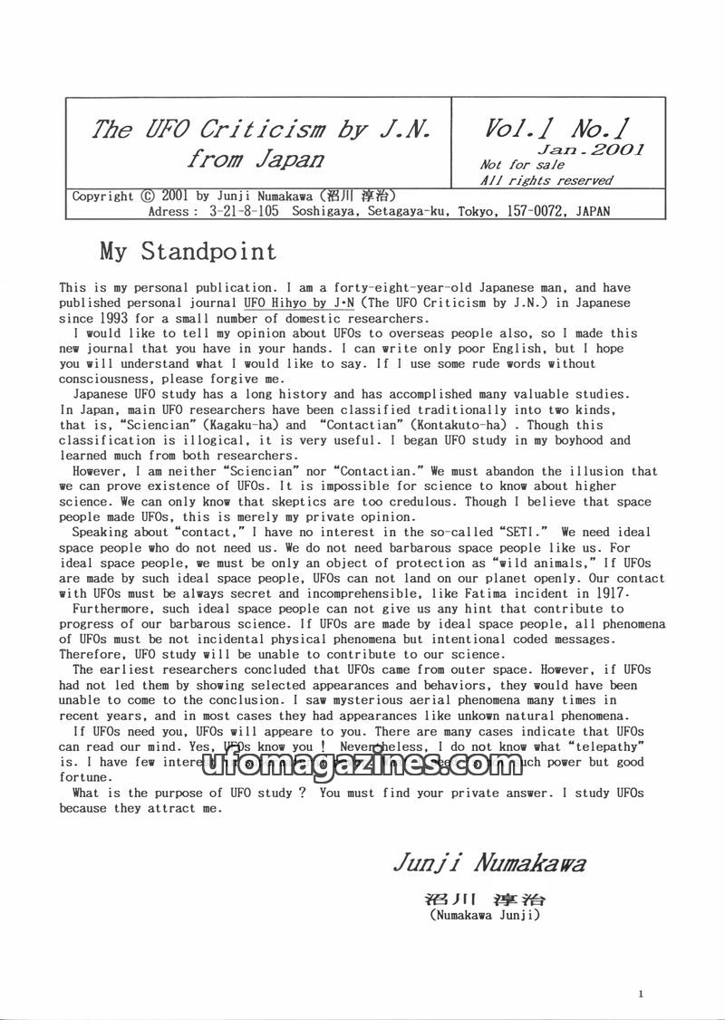 This issue of 'The UFO Criticism' by J.N. from Japan explores the author's "standpoint" on UFOs, arguing for the existence of "ideal space people" beyond human comprehension. It ex