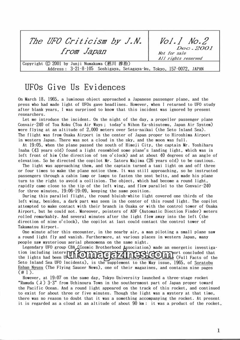 This issue of 'The UFO Criticism by J.N. from Japan' critically examines UFO phenomena, focusing on the 1965 Convair-240 incident over the Seto Inland Sea and the 1947 Kenneth Arno