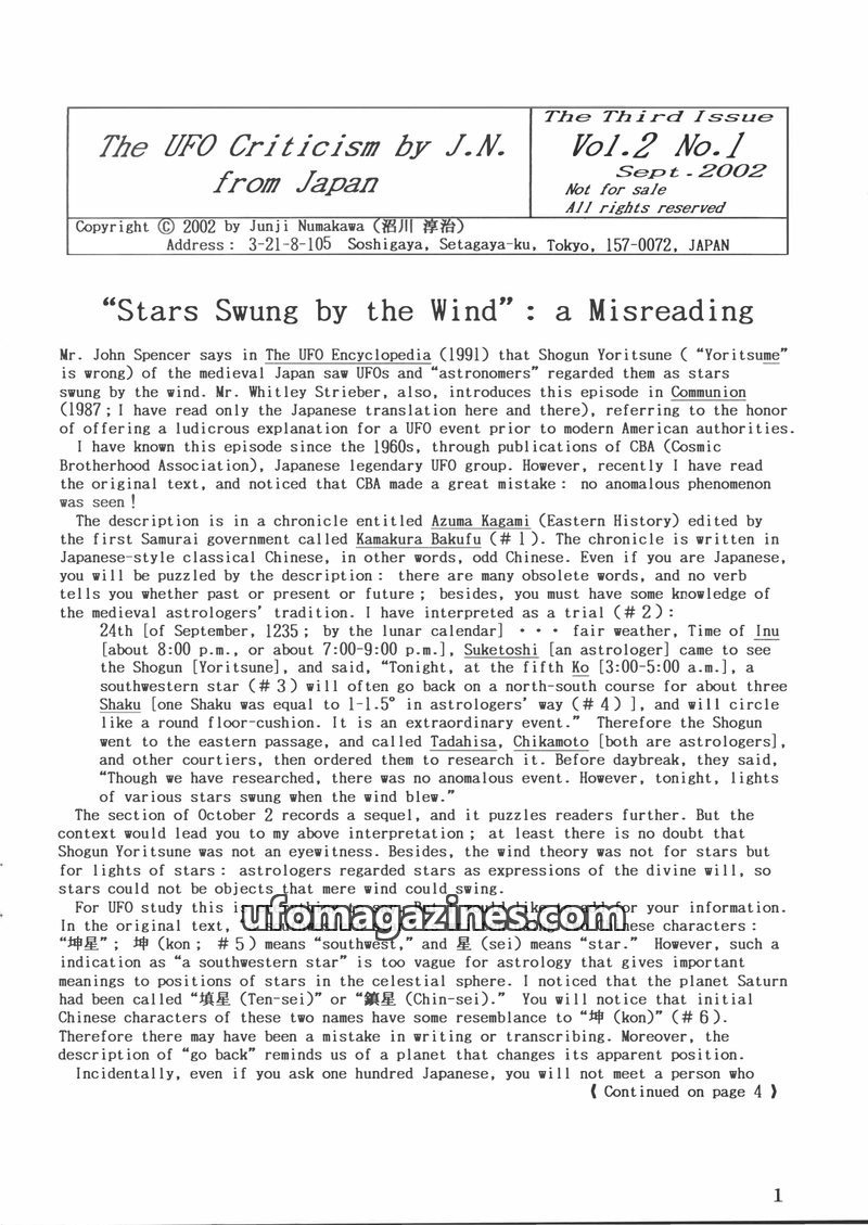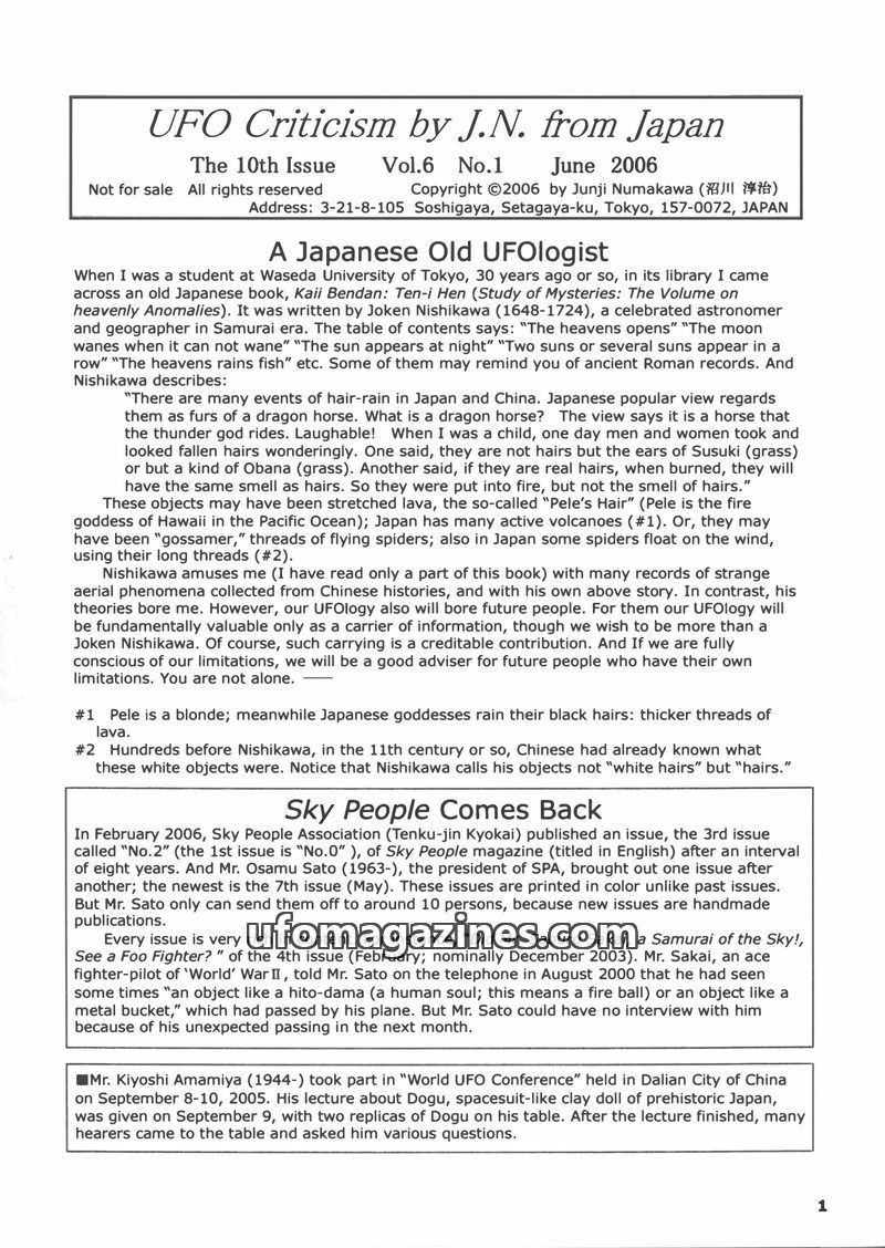 This issue of 'UFO Criticism by J.N. from Japan' delves into historical accounts of aerial phenomena in Japan and China, referencing the 17th-century astronomer Joken Nishikawa and
