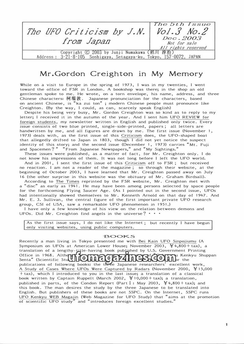 This issue of 'The UFO Criticism by J.N. from Japan' (Vol. 3, No. 2, Dec 2003) includes a personal memoir of UFO researcher Gordon Creighton, discussing his early encounters and vi