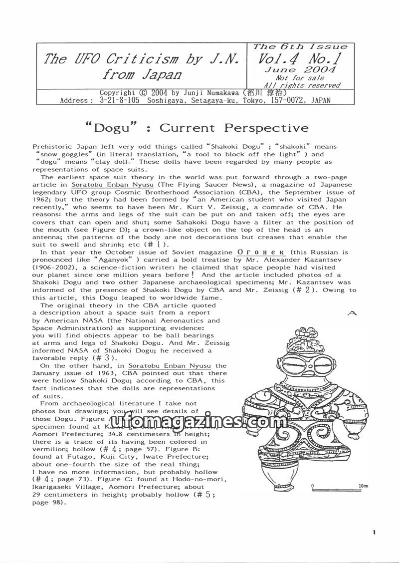This issue of 'The UFO Criticism by J.N. from Japan' delves into theories connecting ancient Japanese 'Dogu' artifacts, particularly the Shakoki Dogu, to representations of space s