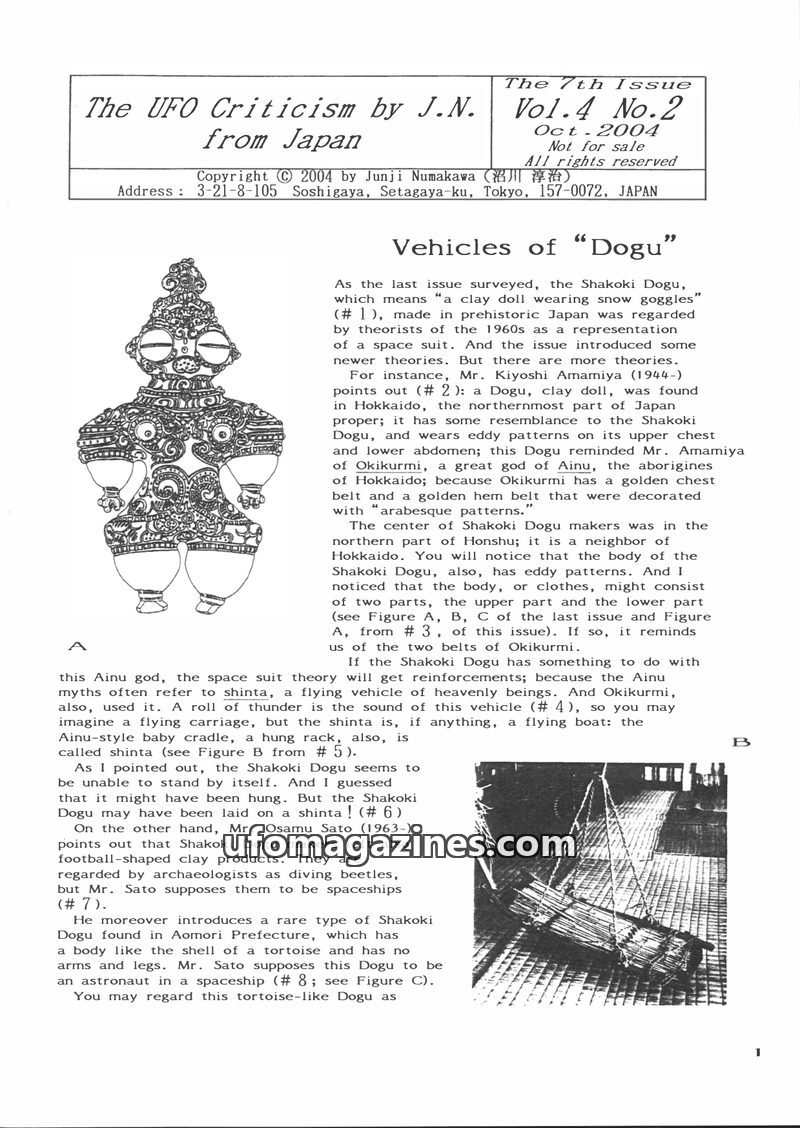 This issue of 'The UFO Criticism by J.N. from Japan' delves into the 'Shakoki Dogu,' prehistoric Japanese clay dolls, and the controversial theory that they represent ancient space
