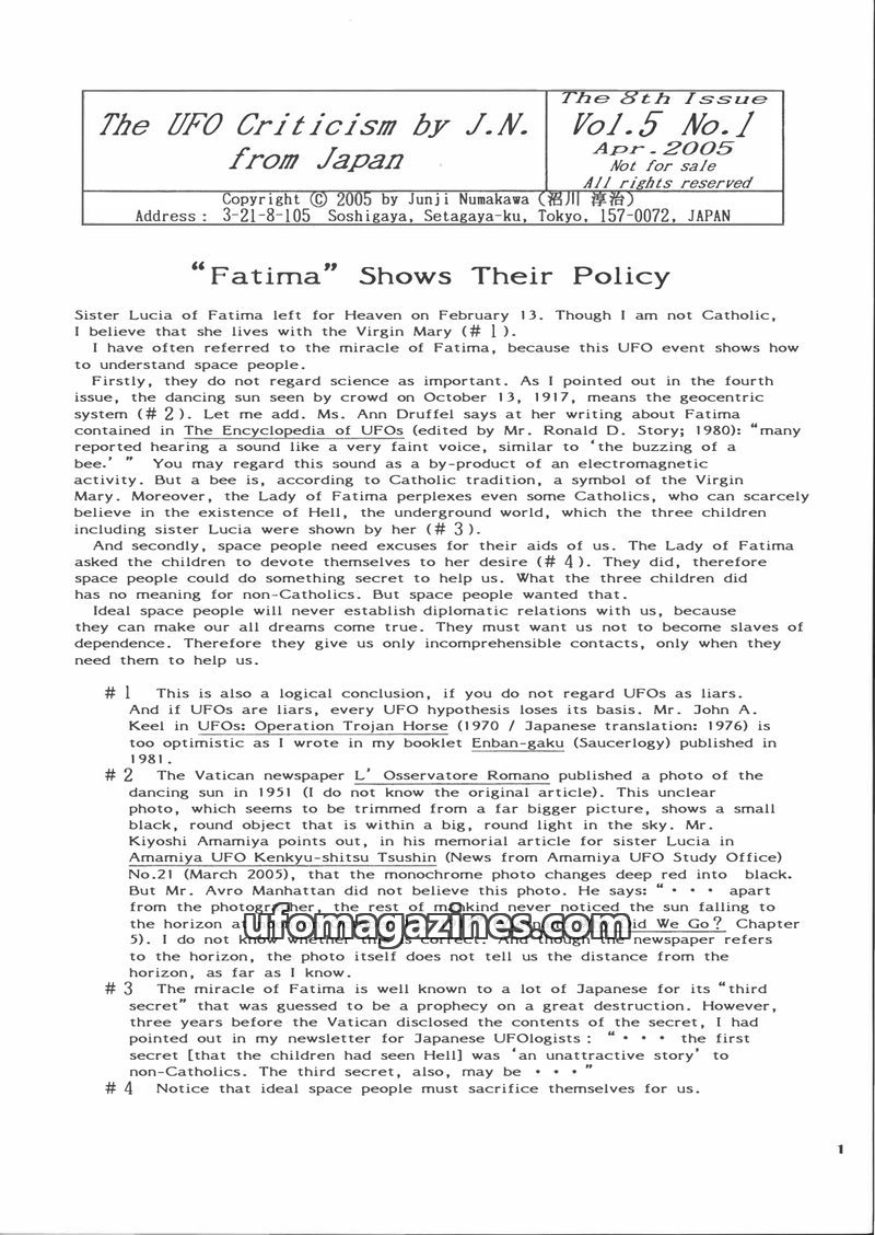 This issue of 'The UFO Criticism by J.N. from Japan' discusses the Fatima miracle, suggesting it reveals the policy of 'space people' who avoid direct contact to prevent human depe