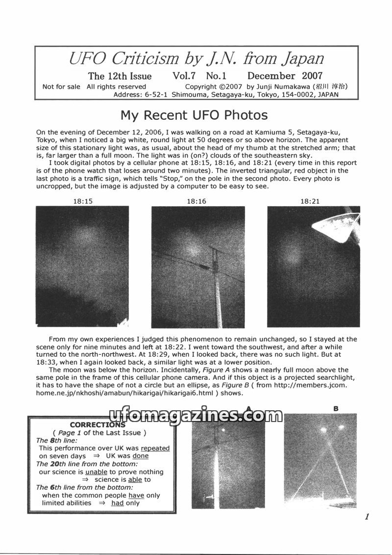 This issue of 'UFO Criticism by J.N. from Japan' details a personal UFO sighting by the author on December 12, 2006, in Tokyo, including photographic evidence. It also covers a 'Sk